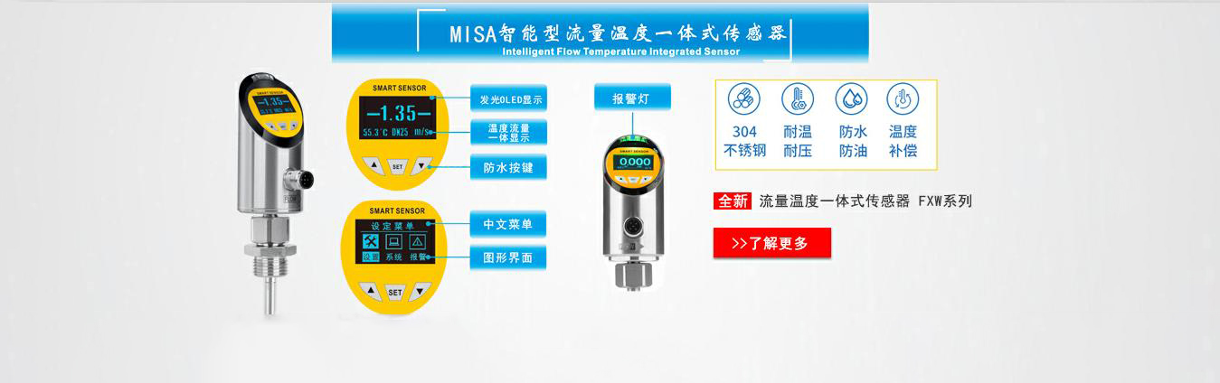 MS-FXG 流量溫度傳感器產(chǎn)品特點: 1、溫度和流量 一體式傳感器 2、自發(fā)光OLED;顯示清晰銳利 3、溫度智能顯示報警接點輸出 4、流量智能顯示報警接點輸出 5、中文+圖形界面;傻瓜式菜單 6、數(shù)字通信;模擬量一體式 7、精度高穩(wěn)定性好 8、耐結垢,耐腐蝕 8、全灌封設計全防水殼體 9、耐壓高、高壓型可耐壓10MPa 10、手機掃碼安裝指導功能;無需說明書在線工程師專業(yè)服務
